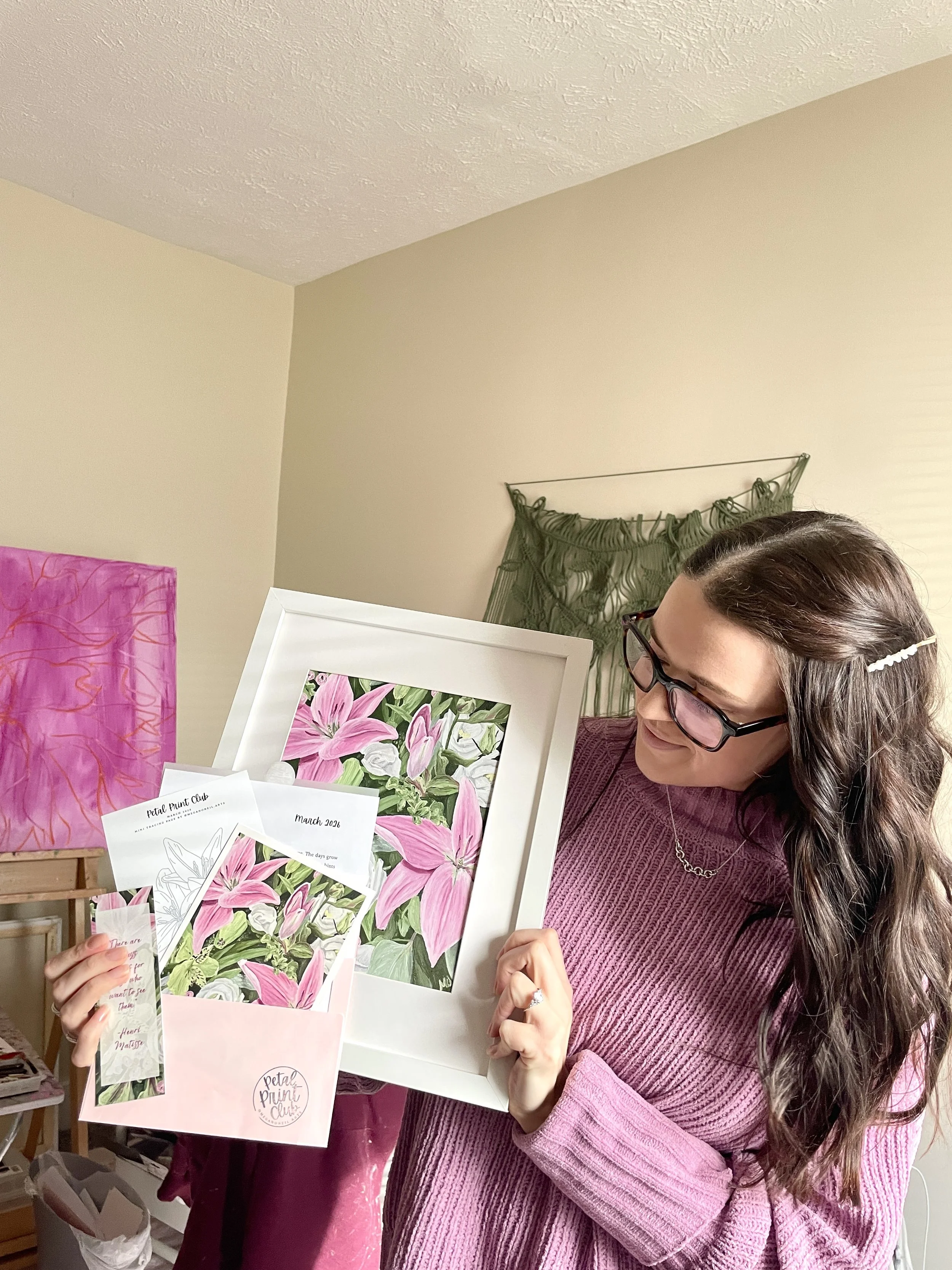 Petal Print Club is a monthly mail subscription to receive a 5x7 inch fine art print, activity sheet, letter, and bonus items!